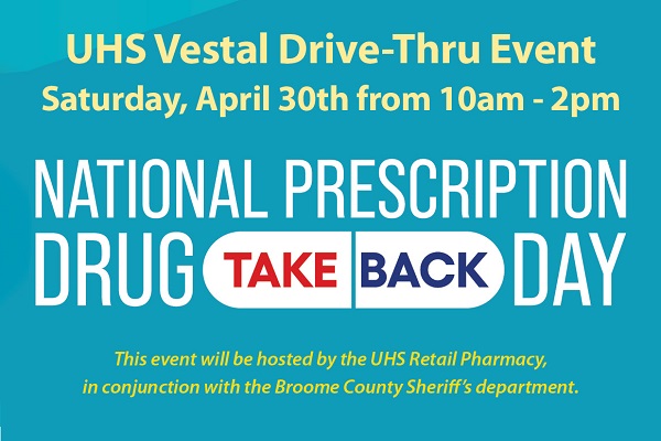 The UHS Vestal Pharmacy will be taking part in National Prescription Drug Take Back Day on Saturday, April 30, 2022 from 10 a.m. to 2 p.m.