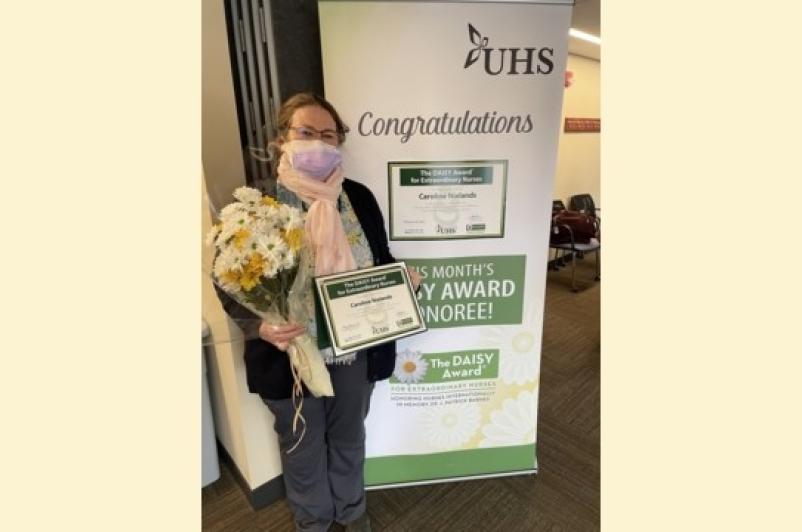 A program to recognize the care and compassion of extraordinary nurses continues at UHS with Caroline Nielands, MAT, RN, WOCRN, UHSH Wound Ostomy Continence, being named the February winner of the DAISY Award! Caroline was recognized and presented with the award for the achievement, and enjoyed cinnamon rolls, a symbolic treat in honor of Patrick Barnes, whose experience inspired the award.