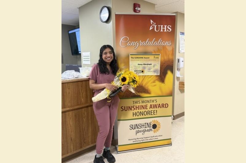 A program to recognize the extraordinary care and contributions of our non-licensed nursing support staff continues at UHS with Jossy Abraham, North Wing 4, UHS Wilson Medical Center, who was named the September winner of the Sunshine Award! Jossy received the Sunshine Award, along with a bouquet of sunflowers in recognition of her accomplishments and enjoyed cookies during the celebration.