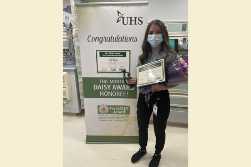 A program to recognize the care and compassion of extraordinary nurses continues at UHS with Erin Perry, BSN, RN, NICU, being named the March winner of the DAISY Award! Erin was recognized and presented with the award for the achievement, and enjoyed cinnamon rolls, a symbolic treat in honor of Patrick Barnes, whose experience inspired the award.