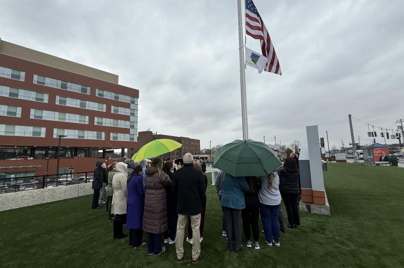 The flag-raising was attended by UHS employees and leaders, along with representatives from the Spiritual Care and Security departments, plus staff from the regional Center for Donation & Transplant. Featured attendees also included the family of an organ donor.