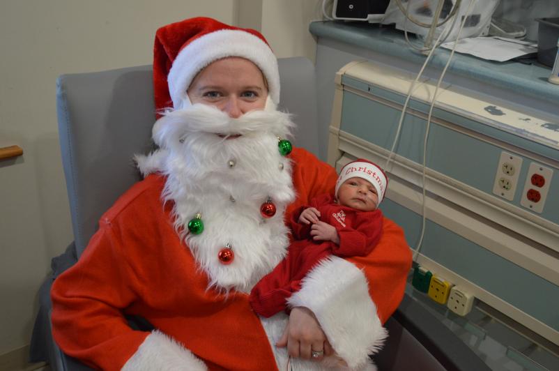 Kailey Veruto, RN volunteered to be Santa this year - she came in on her day off, even with the snow! Debra Kiehle, RN came up with the idea to have their photo taken so they look like they are the present. Anna Zeyak, NA made the Best Gift Ever sign for the presents. Mercedez Merton, RN took the photos. Linda Bowker, RN handmade the beautiful "1st Christmas" hats. And lastly, Maria Thompson, RN, purchased Christmas outfits.