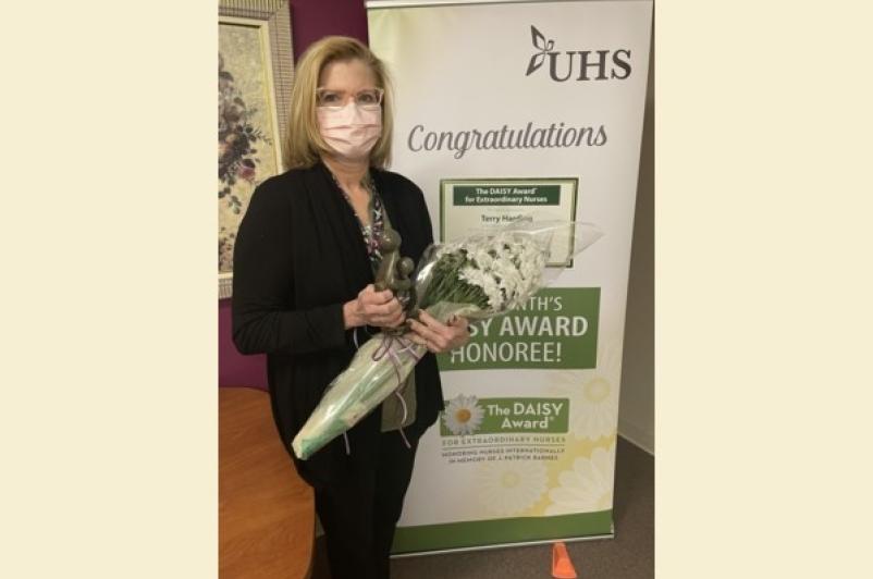 A program to recognize the care and compassion of extraordinary nurses continues at UHS with Terry Harding, NP, UHS Occupational Medicine, being named the January winner of the DAISY Award! Terry was recognized and presented with the award for the achievement, and enjoyed cinnamon rolls, a symbolic treat in honor of Patrick Barnes, whose experience inspired the award.