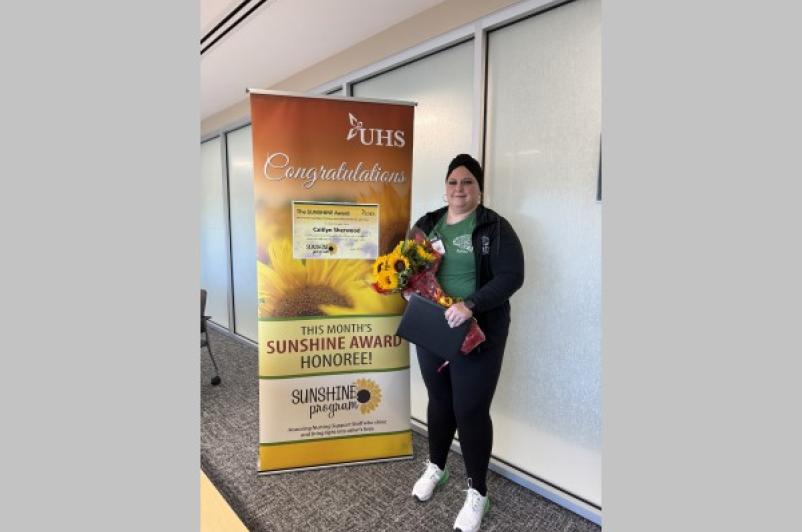 A program to recognize the extraordinary care and contributions of our non-licensed nursing support staff continues at UHS with Caitlyn Sherwood, Main Tower 3, UHS Wilson Medical Center, who was named the June winner of the Sunshine Program Award! Caitlyn received the Sunshine Award and a bouquet of sunflowers in recognition of his accomplishments and enjoyed cookies during the celebration.