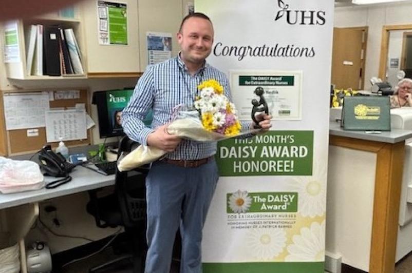 A program to recognize the care and compassion of extraordinary nurses continues at UHS with Philip Nedlik, MSN, FNP-C, RN, UHS Newark Valley Primary Care, being named the January winner of the DAISY Award! Philip was recognized and presented with the award for the achievement, and enjoyed cinnamon rolls, a symbolic treat in honor of Patrick Barnes, whose experience inspired the award.