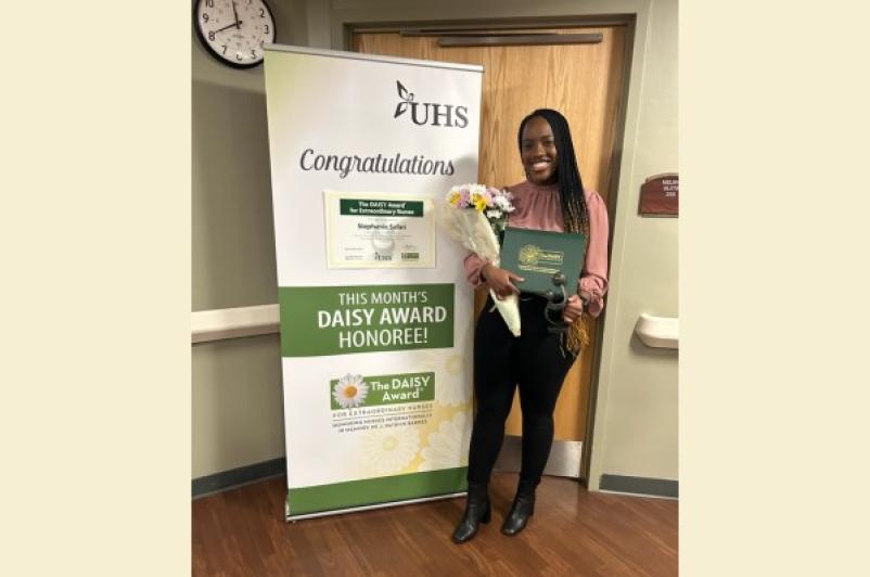 A program to recognize the care and compassion of extraordinary nurses continues at UHS with Stephie Safari, BSN, UHS Neuro Step Down Suite, being named the November winner of the DAISY Award! Stephie was recognized and presented with the award for the achievement, and enjoyed cinnamon rolls, a symbolic treat in honor of Patrick Barnes, whose experience inspired the award.