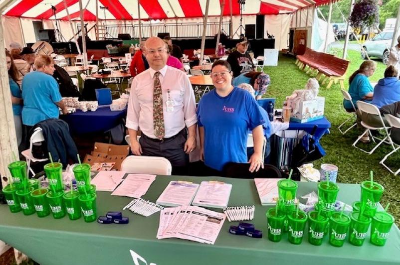 UHS Chenango Memorial Hospital took part in Senior Day at the Chenango County Fair on Thursday, August 8. Katie Olsen and Dr. James Simcoe, UHS Chenango Memorial Hospital Geriatrics, manned the booth and spoke with residents about the services offered by CMH to Seniors.