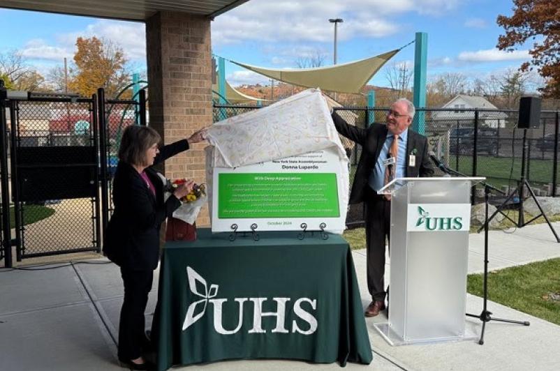 At UHS Child Care on Thursday, October 24, a plaque was unveiled by UHS President and CEO John Carrigg to dedicate the center's playground to New York State Assemblywoman Donna Lupardo.