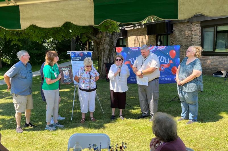 Rolland “Boomer” Bojo, Jr., President and CEO of UHS Delaware Valley Hospital took the opportunity at the recent annual staff recognition barbecue to dedicate the Volunteers’ Gift Shop to Mary Hunter, long-term member and president for 21 years.