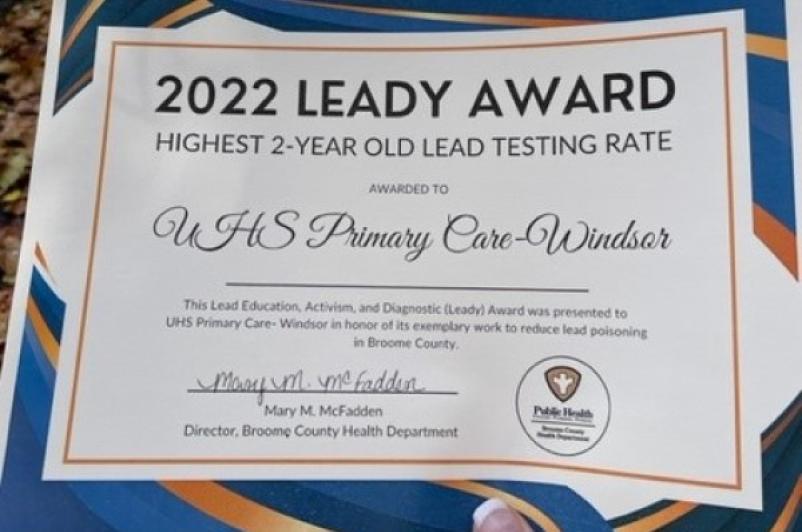 "I am extremely proud of my staff and our providers for receiving this recognition from the Health Department," said Victoria Paden, UHS Primary Care Windsor Physician Practice supervisor. "Their dedication to their patients and making sure they receive the appropriate testing for lead is inspiring and I am proud to work with this team."