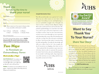 The DAISY (Diseases Attacking the Immune SYstem) Award is an international recognition program that honors and celebrates the skillful, compassionate care nurses provide every day. The DAISY Foundation was established by the family of J. Patrick Barnes after he died from complications of the auto-immune disease ITP in 1999. During his hospitalization, they deeply appreciated the care and compassion shown to Patrick and his entire family. When he died, they felt compelled to say “thank you” to nurses in a very public way. To learn more, visit DAISYFoundation.org.